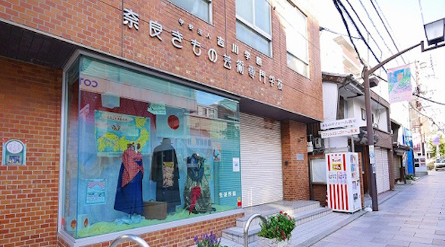 奈良きもの芸術専門学校は、近鉄奈良駅から徒歩約2分、JR奈良駅から徒歩約10分の場所にあります。学校は、小西さくら通り商店街のなかにあり、学校周辺には昔ながらのお店が軒を連ねており、観光客や地元住民で賑わっています。